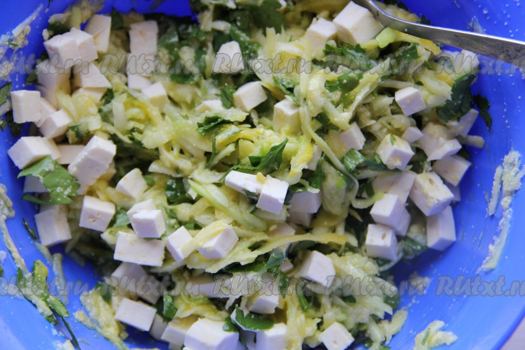 В самом конце добавить сыр (если используете сыр твёрдых сортов, тогда натрите его на тёрке, если готовите, как я, с мягким сыром, типа брынзы, тогда нарежьте его кубиками), перемешать кабачково-сырную массу.