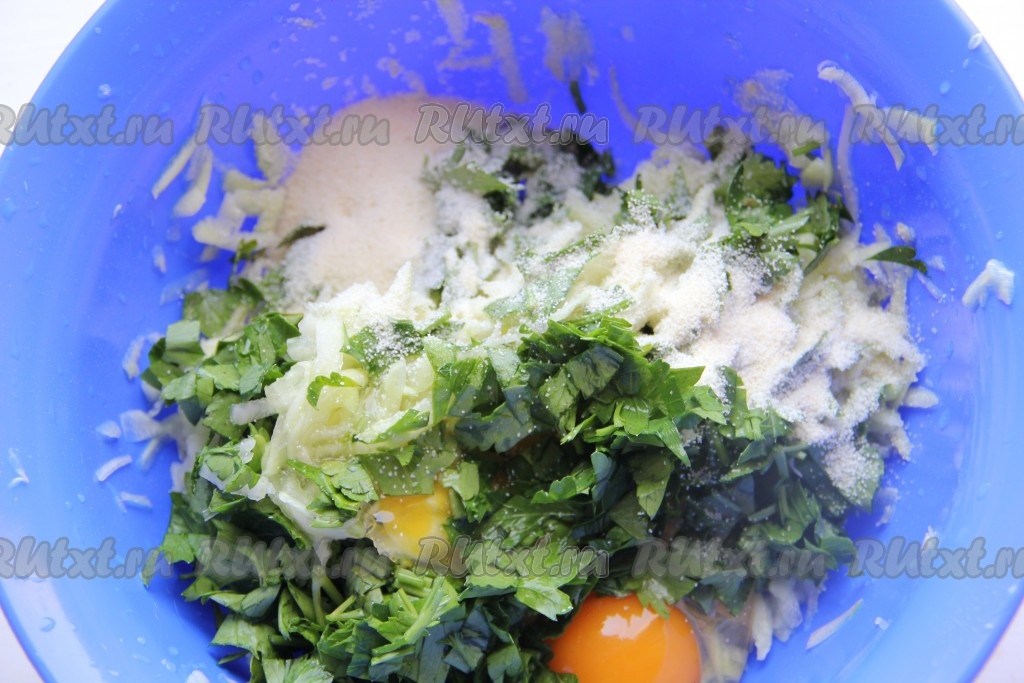 К кабачку, отжатому от сока, добавить яйца, 1 столовую ложку манки и мелко нарезанную петрушку, перемешать. Масса должна получиться достаточно густой. Если же, в зависимости от сочности и величины кабачка, масса получилась не очень густой, тогда добавьте ещё 1 столовую ложку манки и тщательно перемешайте.