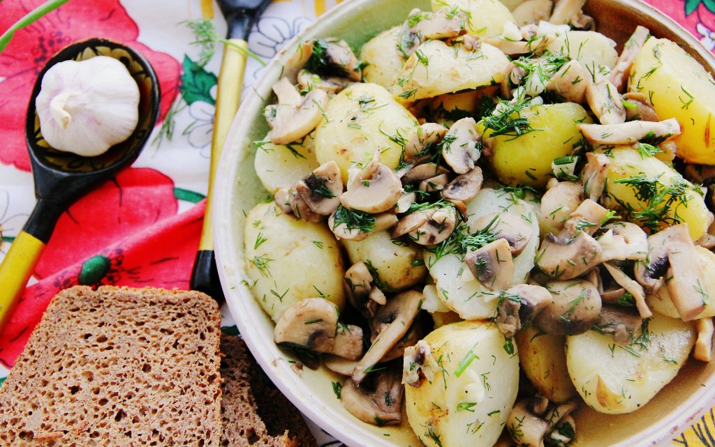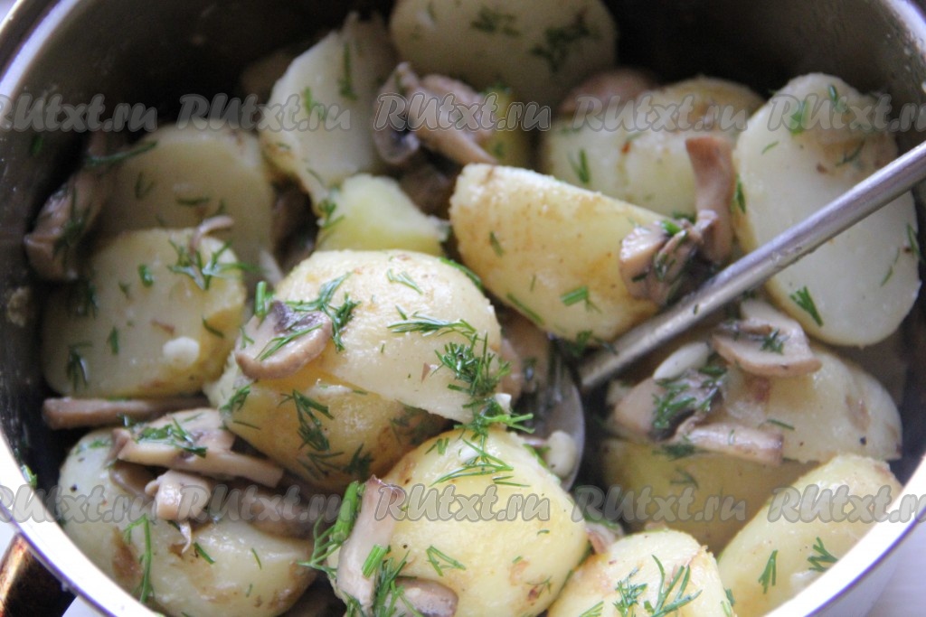 Подать с солеными огурчиками или овощными салатами. Молодой картофель с грибами готовится очень просто, а получается прекрасное блюдо для повседневного стола.