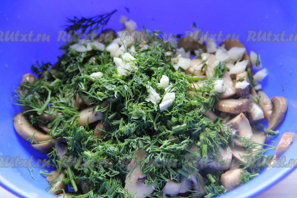 Грибы и лук смешать с мелко рубленным укропом и выдавленным чесноком.