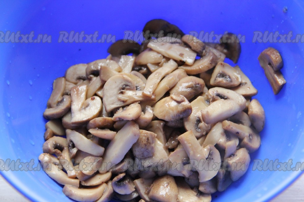 Отдельно обжарить мелко рубленный лук и грибы, в самом конце посолить и поперчить по вкусу.