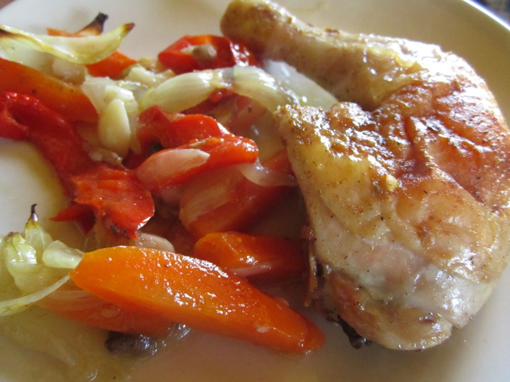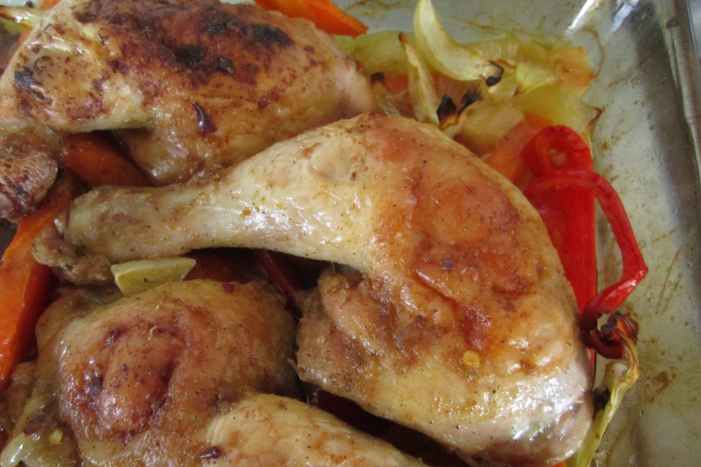 Курочка по этому рецепту готовится очень просто, да и времени на подготовку куриных окорочков и овощей к запеканию уходит немного. Получается сразу и основное блюдо, и гарнир. Вкусный и несложный рецепт освободит руки хозяйки для других важных дел!