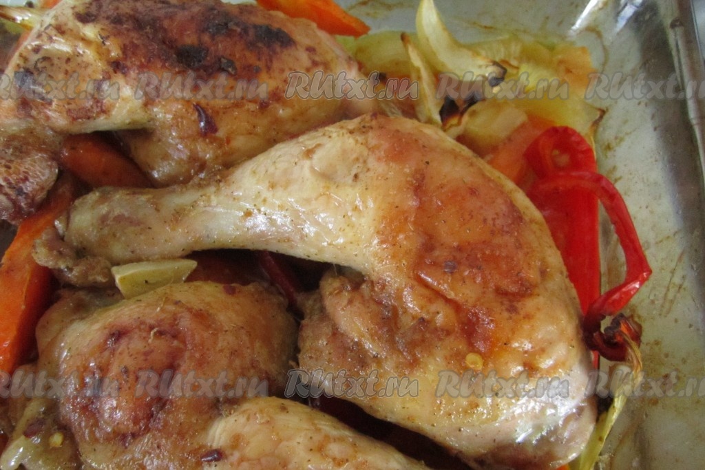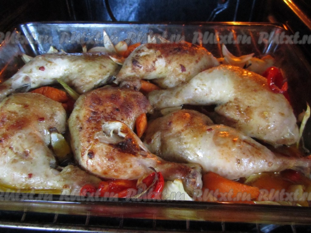 Румяные и ароматные куриные окорочка, запечённые с овощами, готовы!