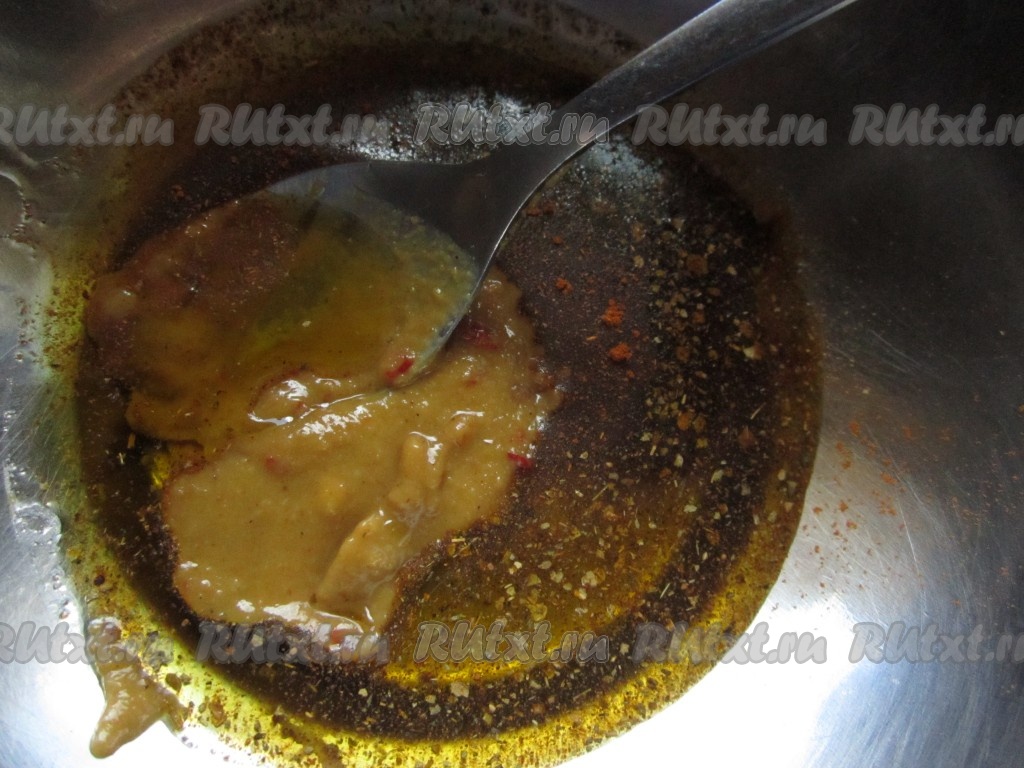 В отдельной ёмкости смешайте оставшееся оливковое масло, горчицу, 1,5 чайные ложки соли и специи.