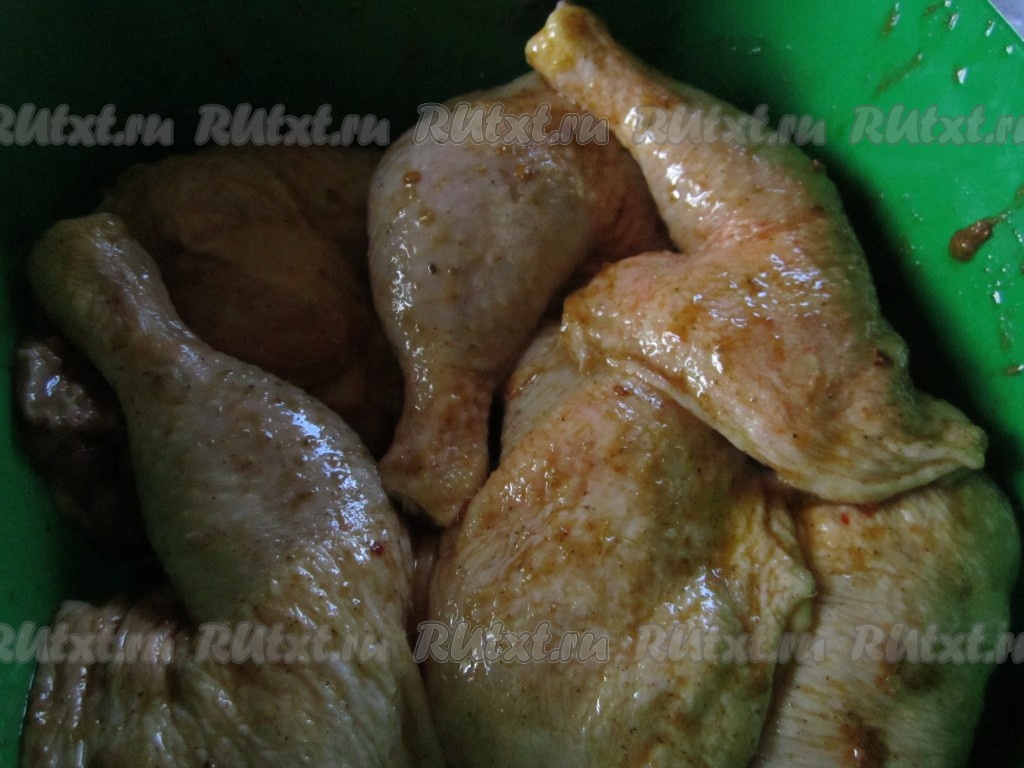 Окорочка положите в глубокую миску и полейте маслом с горчицей и специями. Хорошо обмажьте окорочка со всех сторон.