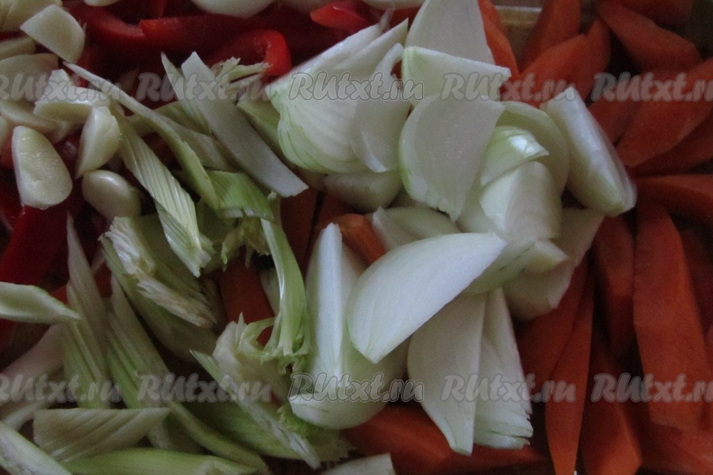 В форму для запекания налейте 2 столовые ложки оливкового масла. Выложите овощи в форму, посолите и хорошо перемешайте, чтобы кусочки были смазаны маслом.