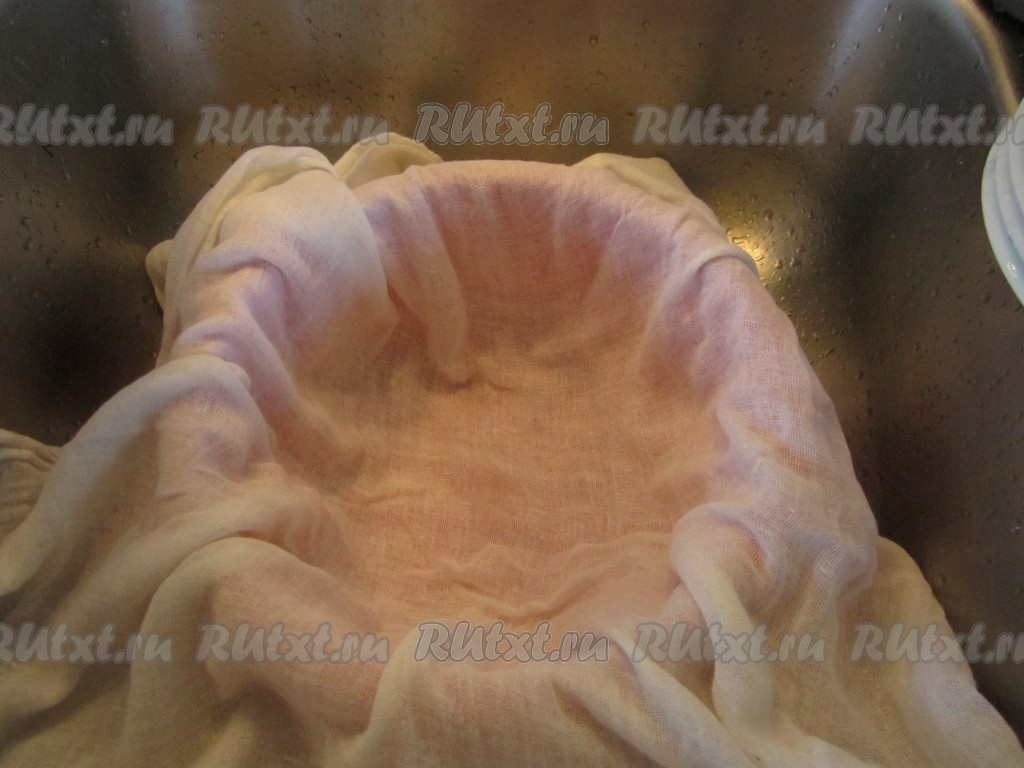 Глубокую миску выстилаем сложенной вдвое марлей (или льняной тканью).