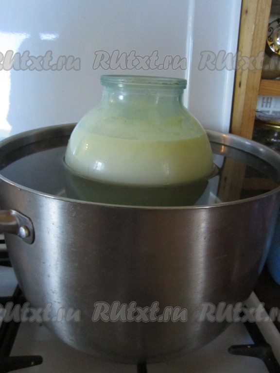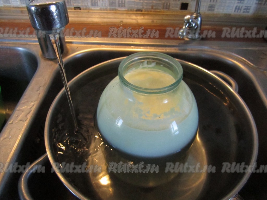 Когда над поверхностью воды начнёт подниматься пар, начинаем чаще проверять нашу простоквашу. Сыворотка должна явственно начать отделяться от густой фракции. Тогда вынимаем банку из кастрюли и остужаем до комнатной температуры.