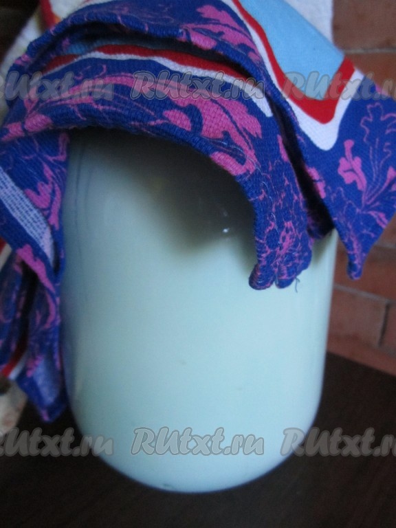 В банку с молоком добавляем ложку простокваши или сметаны. Можно предварительно снять с молока сливки, так как они всё равно при сквашивании отслоятся. Накрываем банку с молоком полотенцем или салфеткой и оставляем в тёплом месте примерно на сутки.