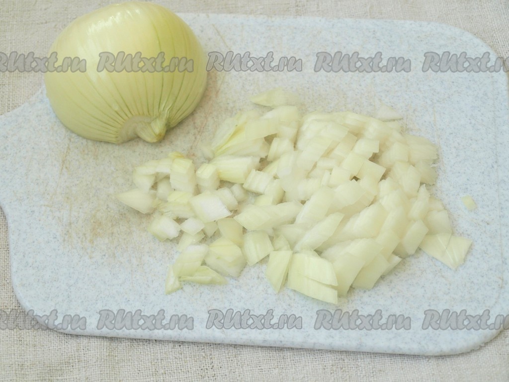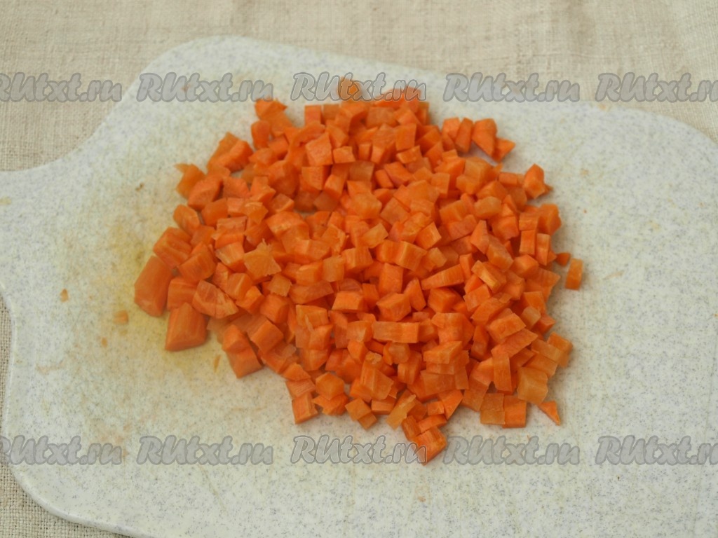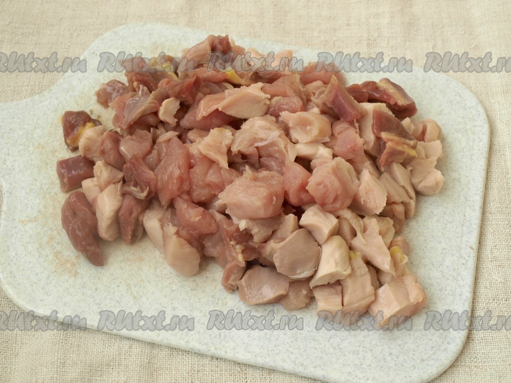 Разогреть в сковороде растительное масло и обжарить кубики курицы до золотистого цвета.