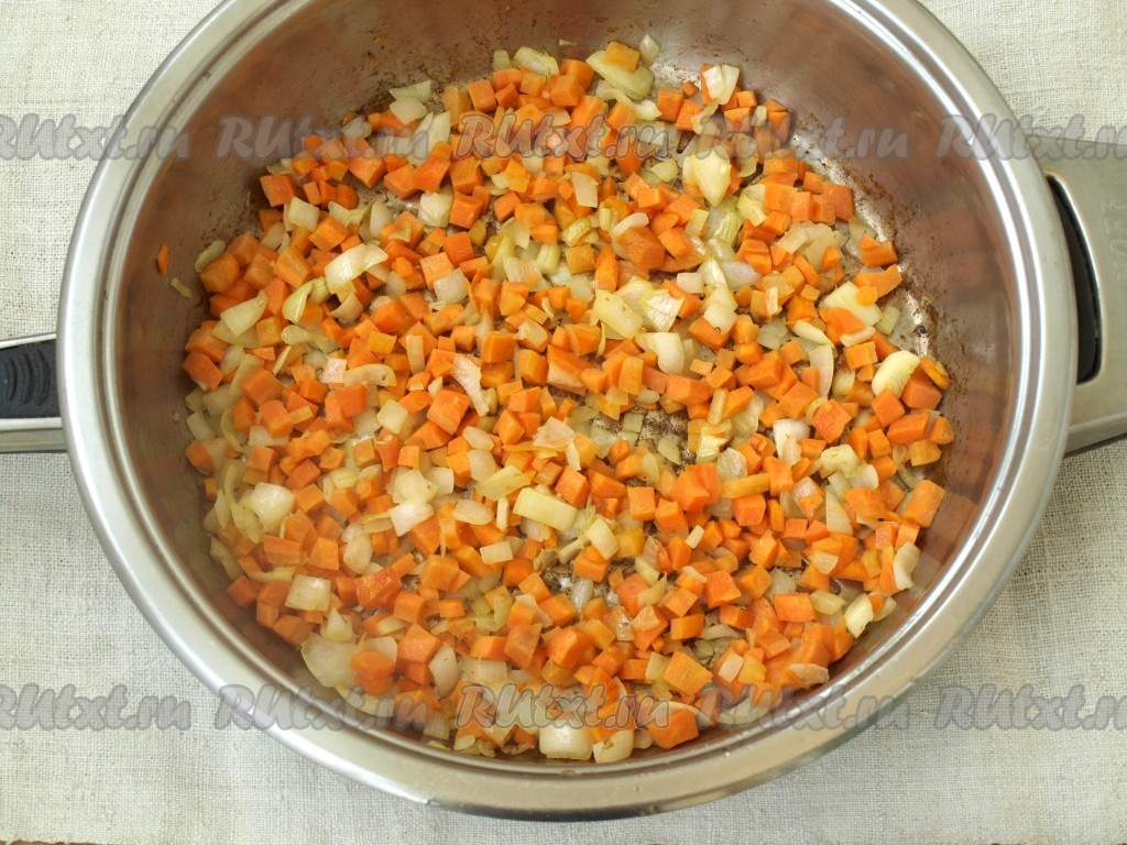 Обжаренное куриное филе переложить со сковороды на тарелку. А в сковороду добавить лук с морковью и обжарить, чтобы они немного зарумянились.