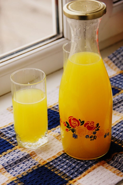 Цитрусовый сок разлить в банки и отправить в холодильник на 30 минут. Наш вкусный, ароматный сок из апельсинов и лимонов готов.