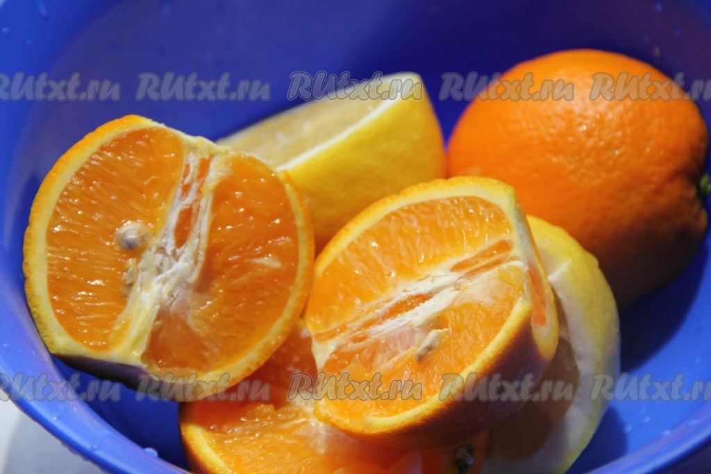 Воду довести до кипения и смешать с сахаром. Остудить воду до 20-30 градусов и залить ею нашу смесь из апельсинов и лимонов. Оставить всю массу на 5-6 часов, не более.