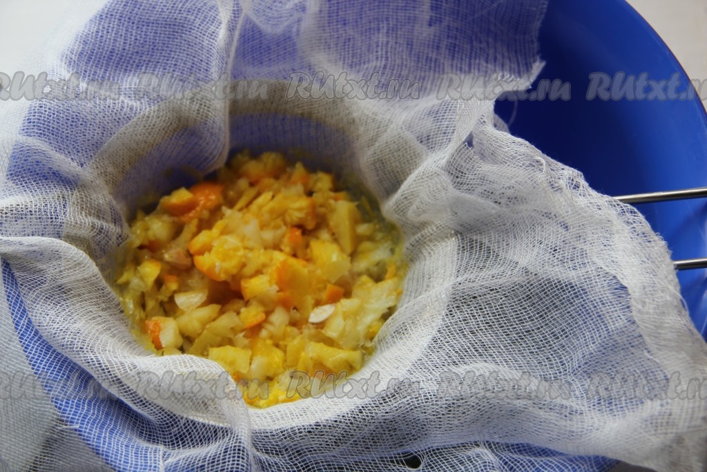 По истечении времени процедить массу через сито, застеленное марлей.