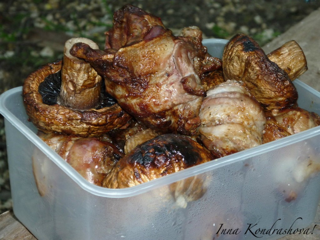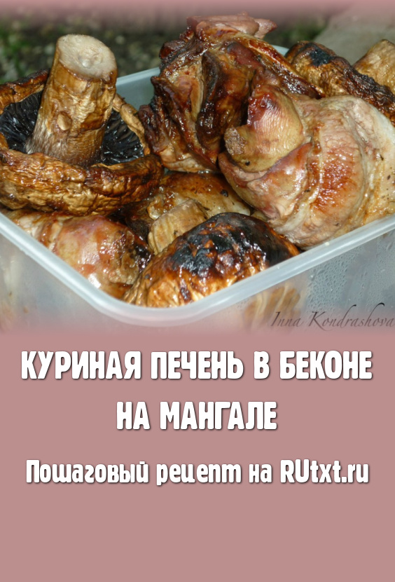 В результате получается поджаристый шашлык из нежнейшей куриной печени в беконе и сочных грибов.