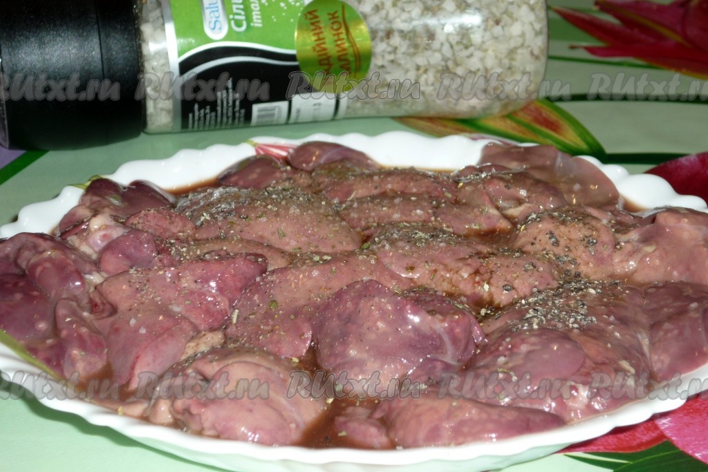 К печёнке добавляем чёрный молотый перец и соль (но не пересолите, соевый соус достаточно солёный), перемешиваем и оставляем на 30-40 минут, чтобы печень хорошо промариновалась.
