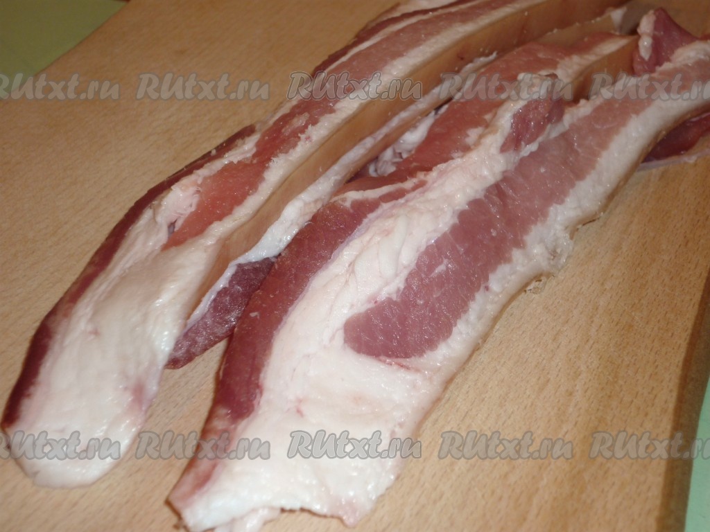 Бекон режем на тонкие, длинные полоски и немножко подсаливаем.