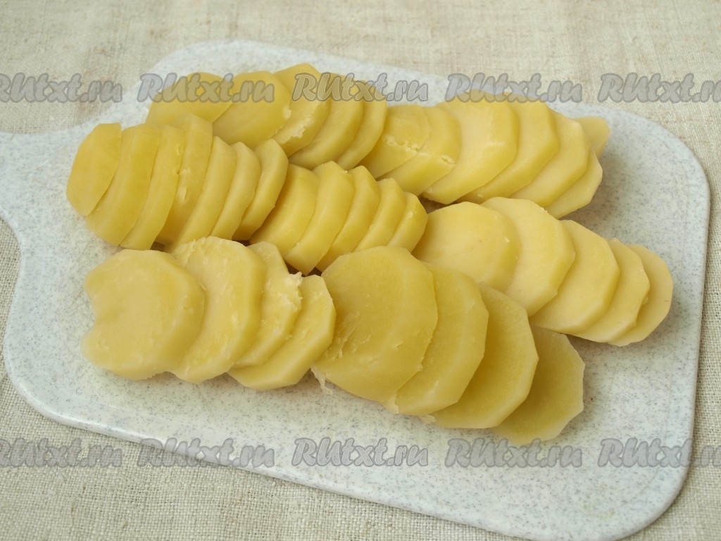 Картофель помыть, очистить и сварить до готовности. Остудить и нарезать кружочками толщиной около 5 мм.
