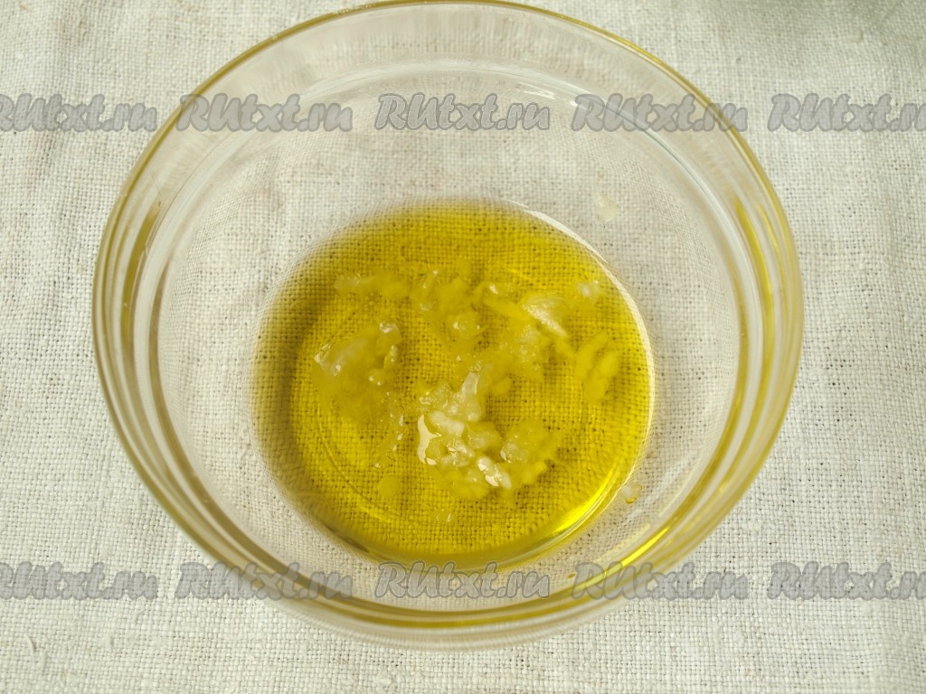 В небольшую ёмкость влить оливковое масло и выдавить чеснок.