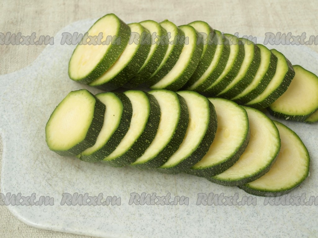 Кабачки также нарезать кружочками (у молодых кабачков кожуру достаточно нежная, поэтому её можно не очищать).