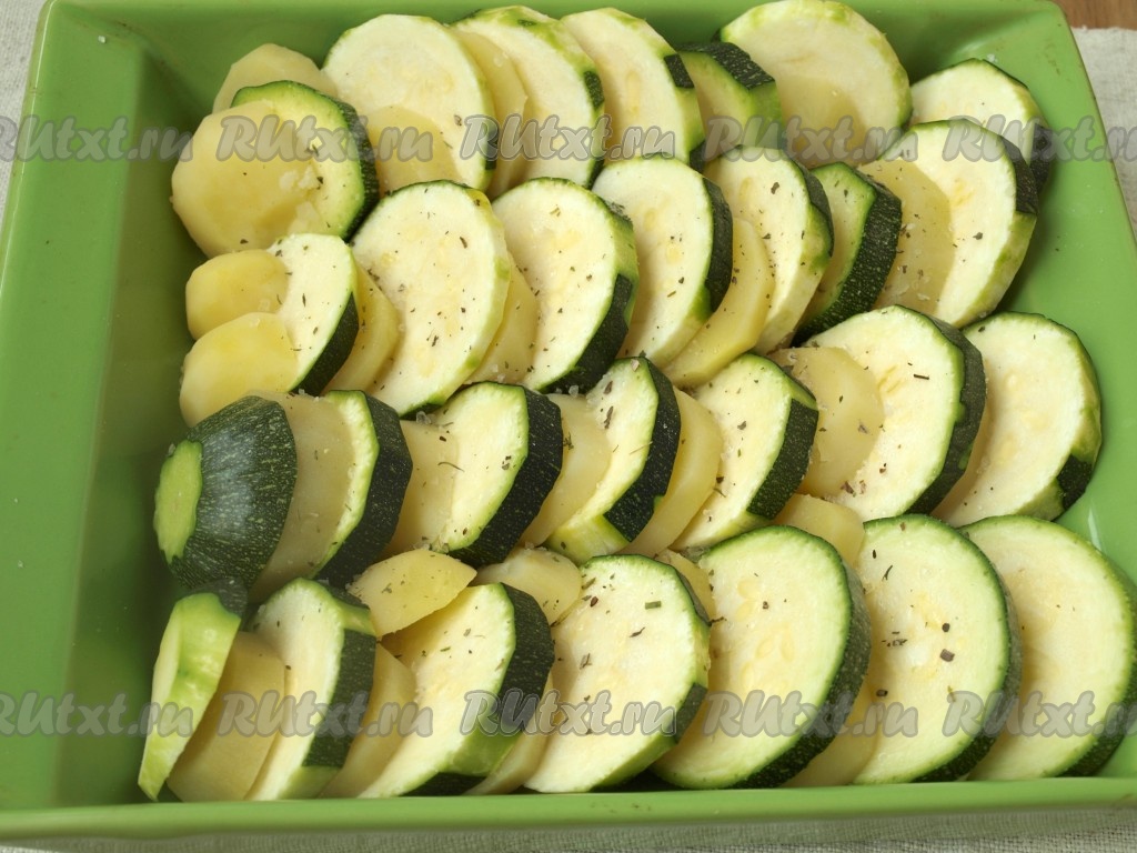 В форму выложить, чередуя, картофель и кабачки. У меня из данного количества овощей получилось 2 формы, 18*18 см и 12*12 см. Посыпать овощи любимыми сушёными травками и солью. Я воспользовалась морской солью со смесью трав.