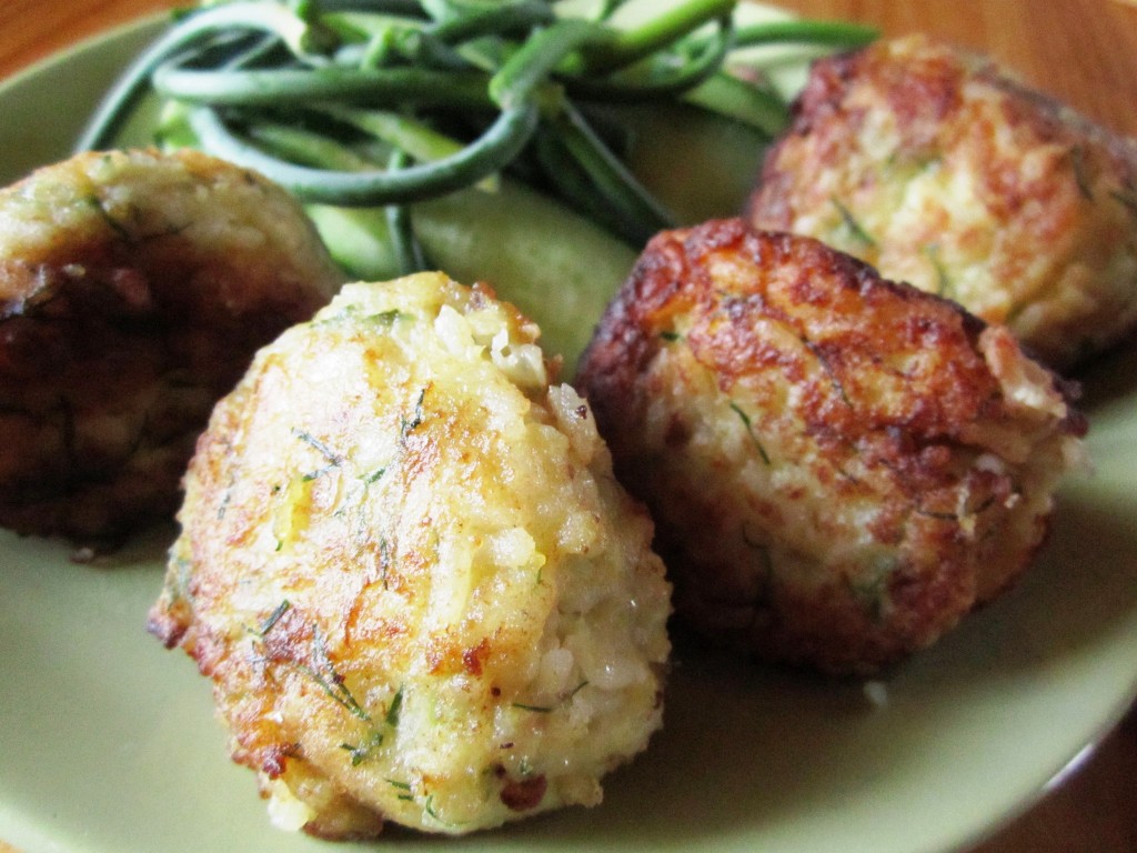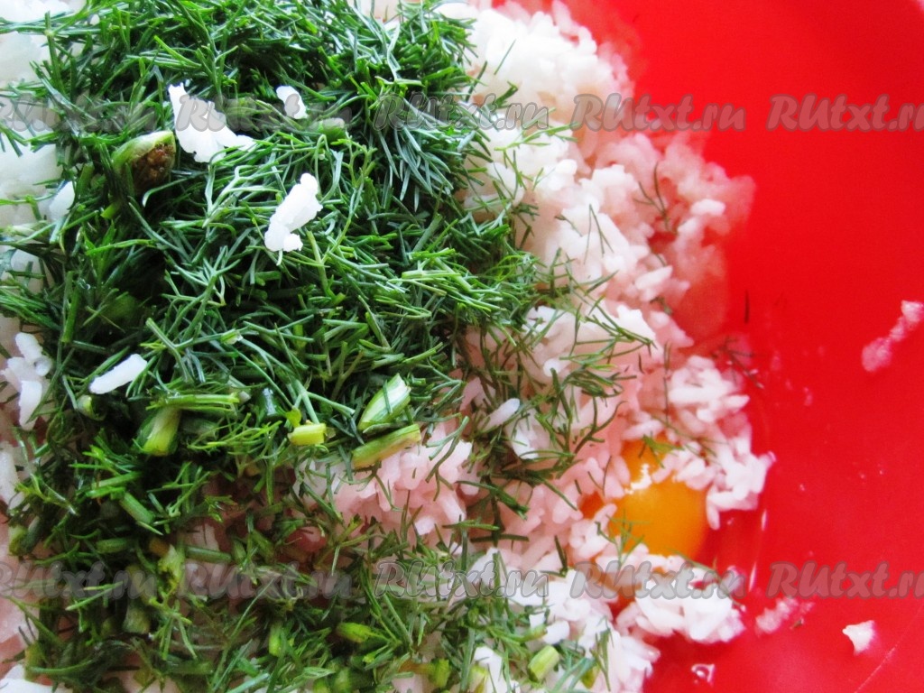 Укроп промыть водой, немного обсушить, мелко нарезать и добавить к рыбному фаршу с рисом.