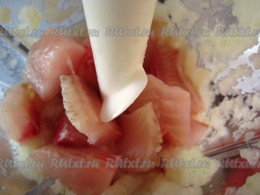 Рыбное филе крупно нарезать и измельчить до состояния фарша (я измельчала в большом стакане блендера в два приёма, но мясорубка тоже подойдёт).
