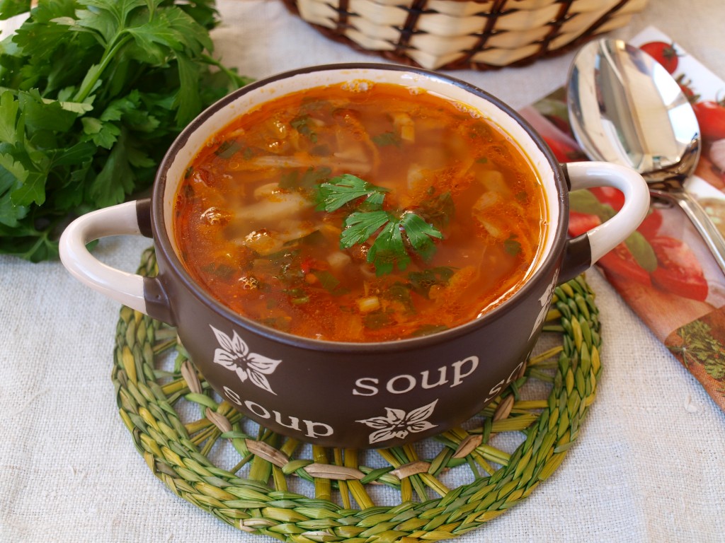 Аппетитный и вкусный борщ, приготовленный с добавлением кильки в томате, разлить по тарелкам и звать домочадцев к обеду.