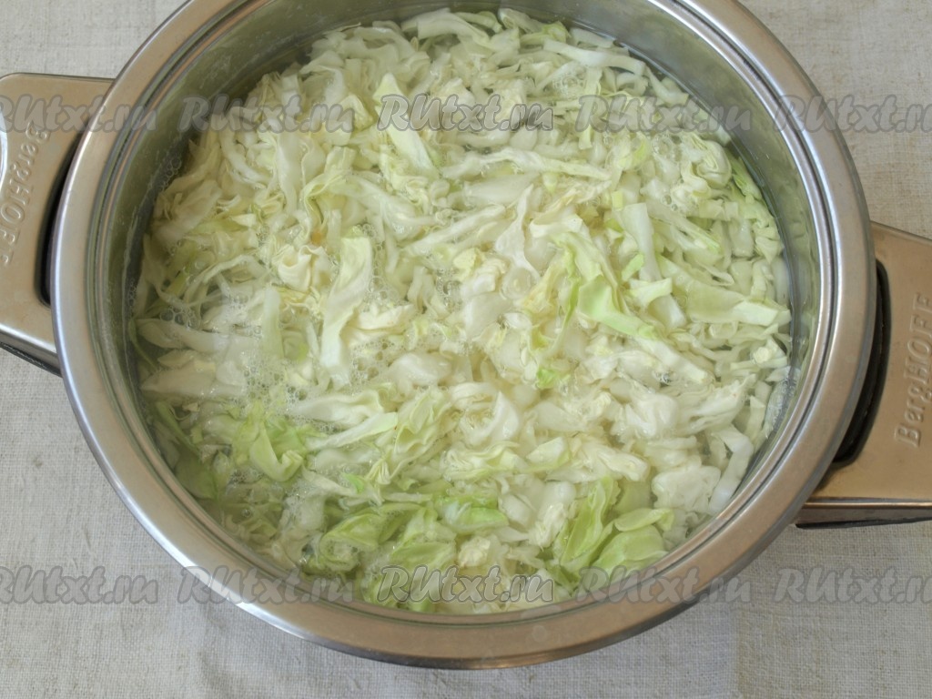 Картофель нарезать кубиками, залить водой и дать закипеть. Снять пену и варить до готовности. За это время нашинковать капусту. Добавить капусту к уже готовому картофелю и варить с момента закипания 5 минут.