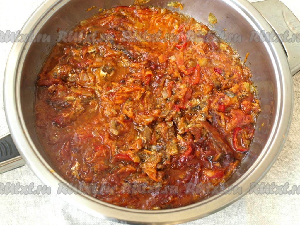 В сковороде разогреть подсолнечное масло, выложить лук и морковь, немного пассировать. Нарезать тонкой соломкой перец, добавить в зажарку. Туда же добавить помидоры, очистив их от шкурки. Помидоры можно нарезать или натереть на тёрке. Томаты немного выпарить и добавить кильку вместе с соусом в сковороду, потушить всё вместе 5 минут.