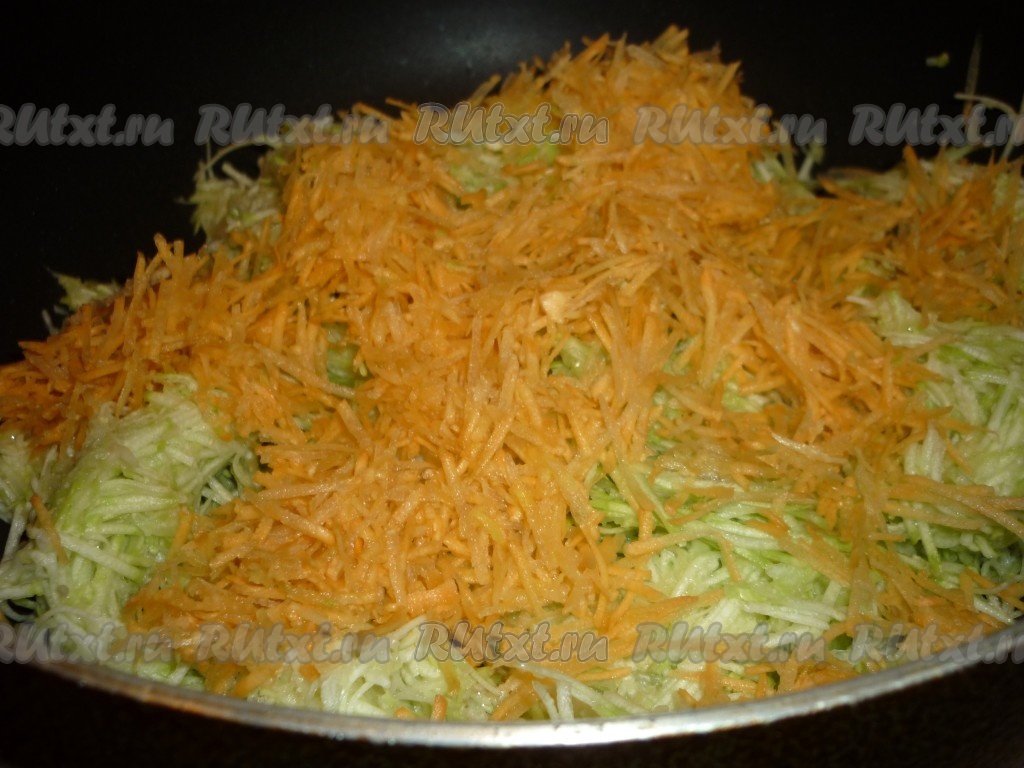 В сковороде разогреть растительное масло, выложить лук, морковь и кабачки, перемешать, тушить 7-8 минут (до мягкости овощей) на среднем огне, помешивая.