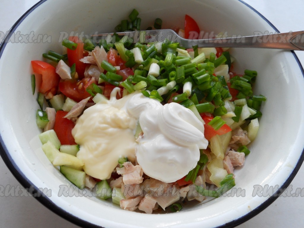 Лук зеленый измельчить и добавить к остальным ингредиентам. Добавить в салат майонез и сметану. По желанию можно использовать только сметану.
