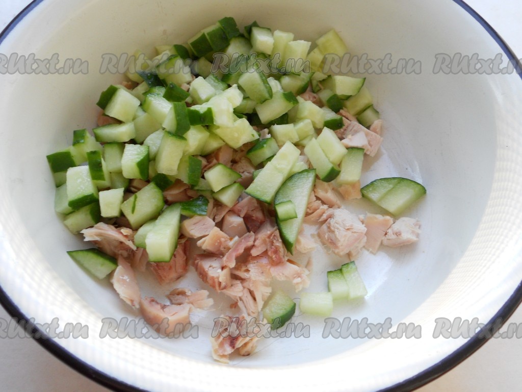Мясо курицы отварить в подсоленной воде до готовности. Остудить и нарезать небольшими кусочками. Свежий огурчик порезать небольшими кубиками.
