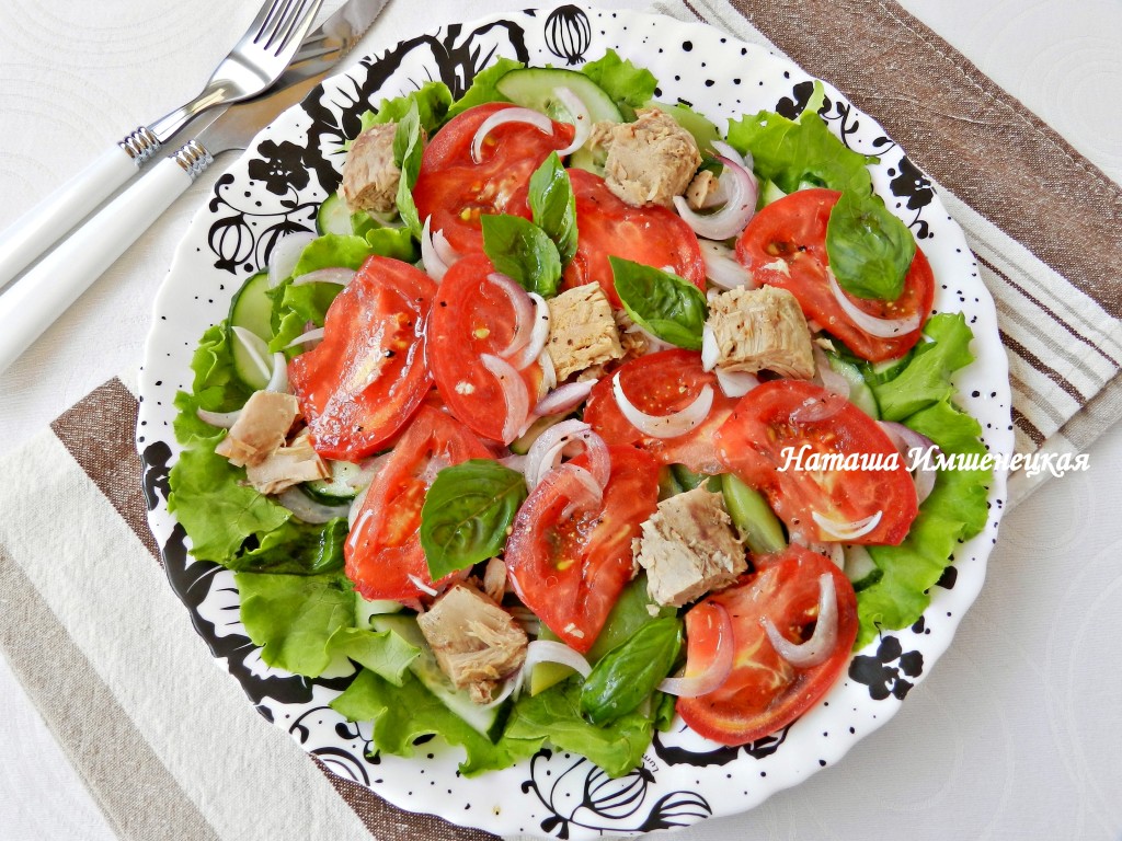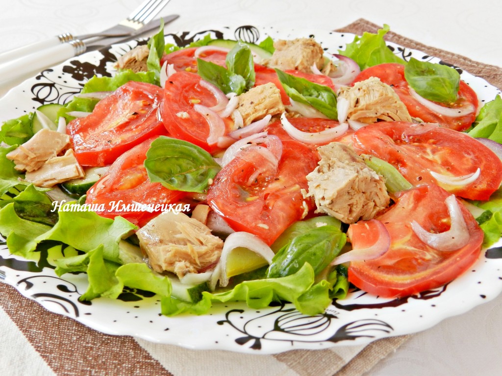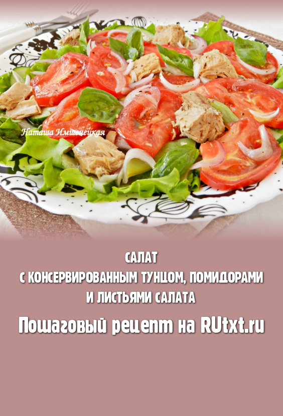Салат, приготовленный с консервированным тунцом, помидорами и листьями салата, - очень вкусный и довольно сытный. Таким салатом вполне можно пообедать или поужинать. Яркий и сочный салатик станет украшением вашего стола в летний день!
