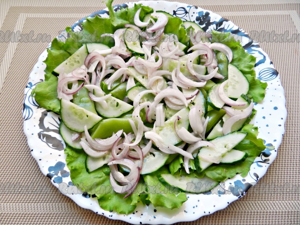На плоскую тарелку выложить листья салата, огурцы и лук.
