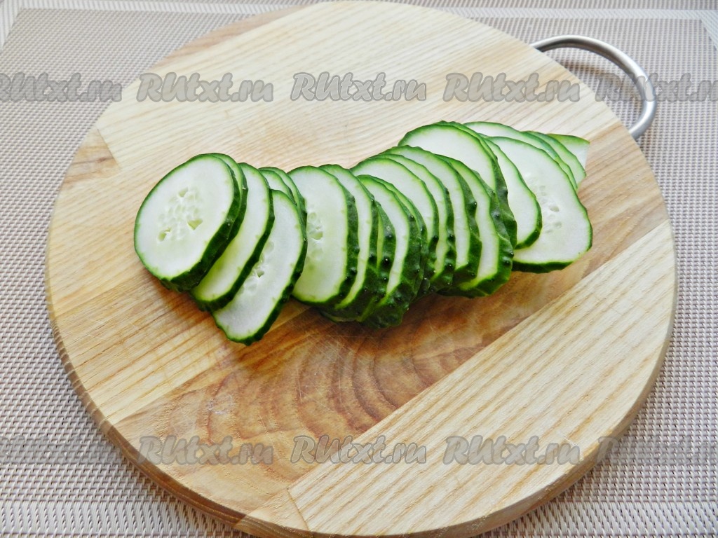 Нарезать огурец на тонкие кружочки.