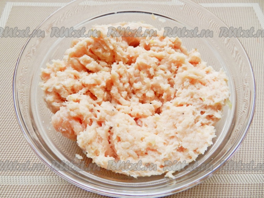 Приготовить фарш из куриного филе и жареного лука. Приправить фарш солью и перцем, добавить сливки, перемешать и разделить фарш на три равные части.