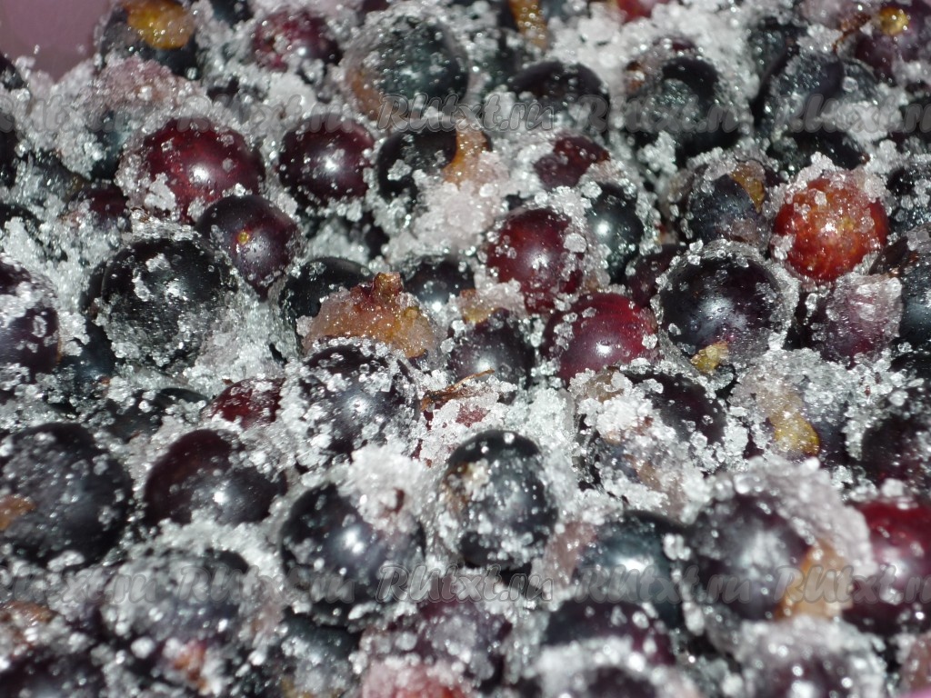 Затем чёрную смородину с сахаром переложить в чашу блендера и взбить до однородной массы. Вылить ягодную массу в кастрюлю, в которой будем варить варенье.