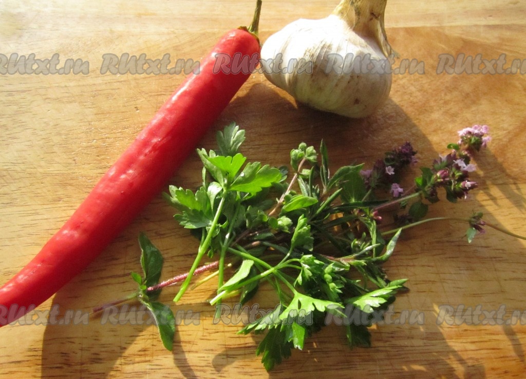 Тем временем измельчите зелень, чеснок и чили.