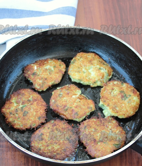 На сковороду налить немного растительного масла, хорошо разогреть и ложкой выкладывать овощную массу.