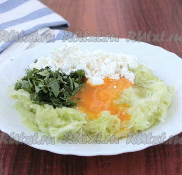 Подготовить все необходимые продукты. Кабачки вымыть, обсушить и натереть на средней терке. С молодых кабачков шкурку чистить не нужно. Хорошо отжать лишний сок.
