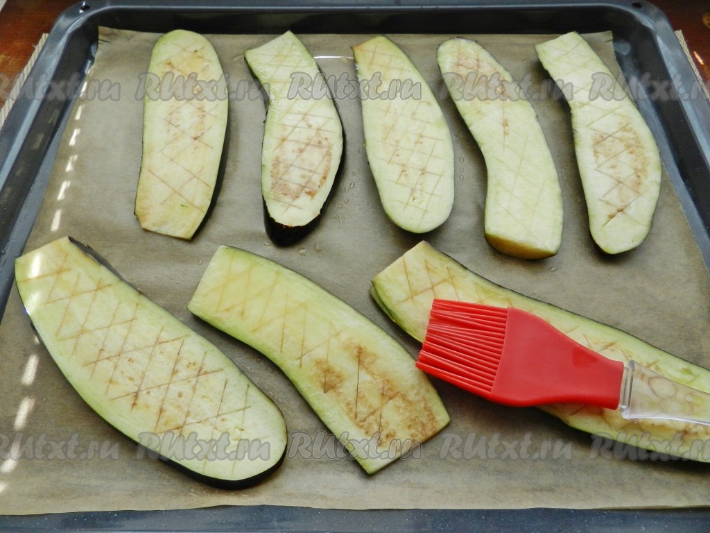 Противень застелить бумагой для выпечки, смазанной маслом. Выложить пластины баклажана, смазать оливковым маслом с помощью кисти.