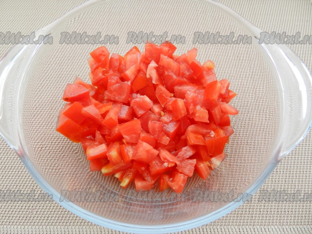Помидоры разрезать, удалить семена. Нарезать помидоры небольшими кубиками.