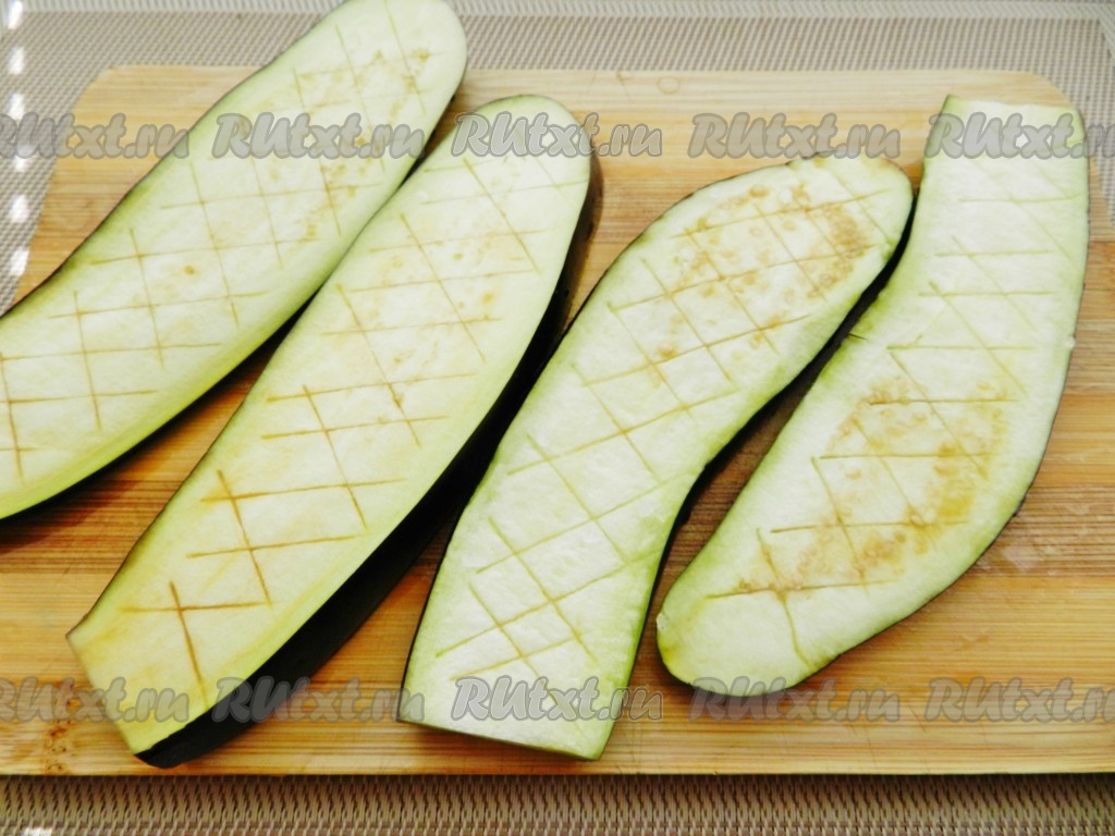 Баклажаны вымыть, нарезать пластинками толщиной не более 1 сантиметра. На поверхности сделать неглубокие надрезы крест накрест. Посолить и оставить на 20 минут. Затем ополоснуть под проточной водой и обсушить.