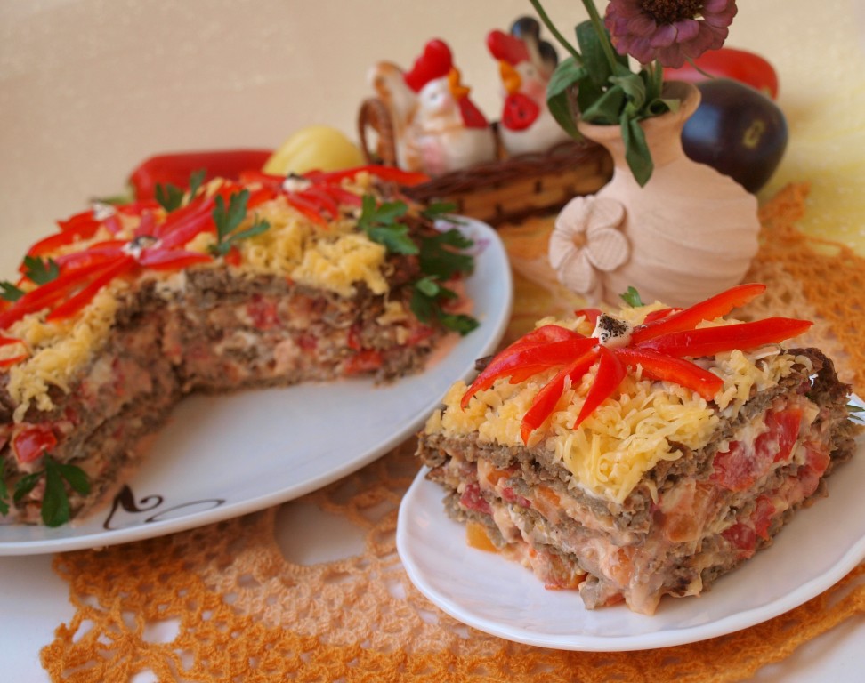 Торту дать пропитаться 1 час в холодильнике, затем можно нарезать. Вот так закусочный баклажановый торт выглядит в разрезе.