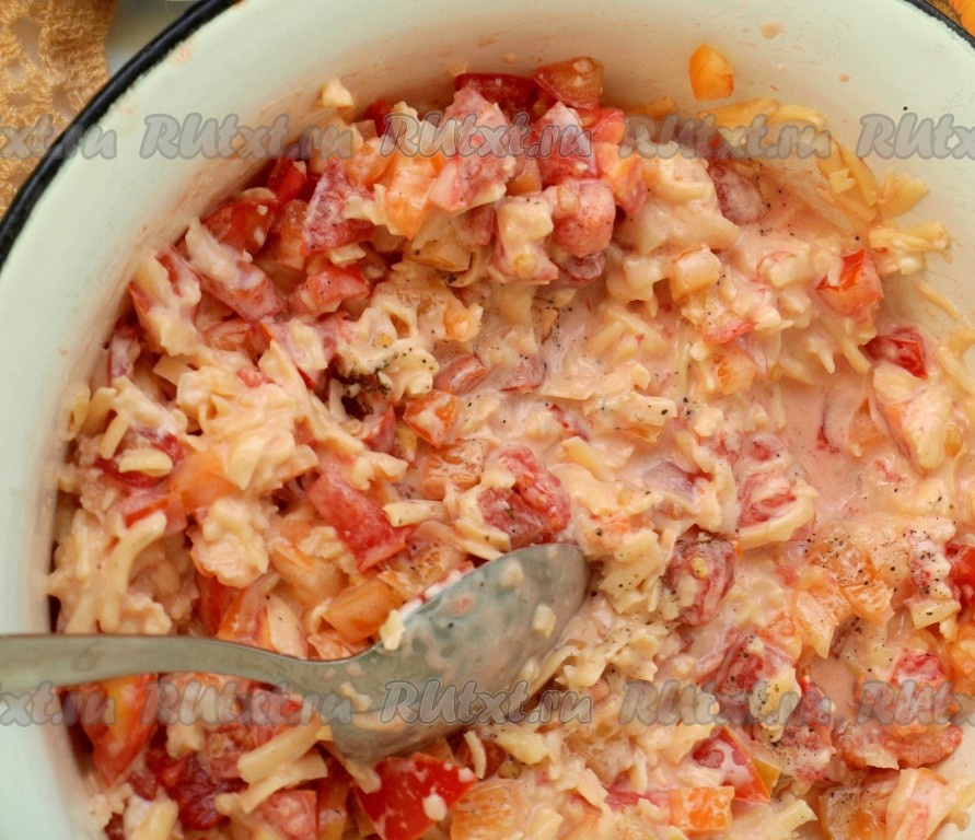 Нарезать кубиками болгарский перец и помидоры, твёрдый сыр натереть на тёрке. Часть сыра отложить в сторону для посыпки верха, а остальной сыр смешать с помидорами и перцем. В овощную массу выдавить чеснок и добавить майонез. Посолить и поперчить.