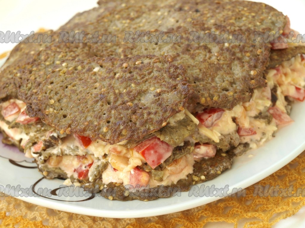 На тарелку внахлёст выложить драники, сверху выложить третью часть начинки и разровнять. Накрыть слоем драников также внахлёст. Я делала 3 слоя, а вы можете сделать по своему усмотрению.