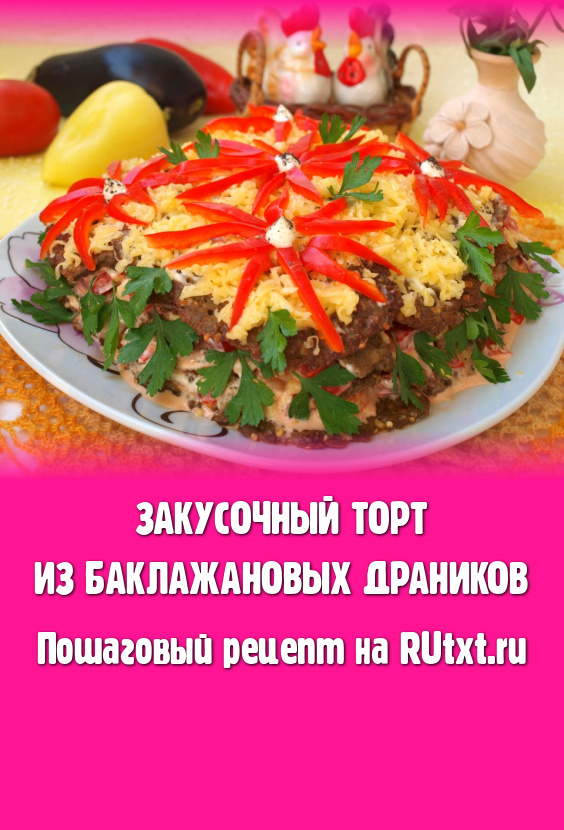 Из баклажановых драников можно приготовить вкусный закусочный торт, который смело можно подать на праздничный стол. После приготовления торту нужно немного времени для пропитки, после чего он прекрасно нарезается на порции.