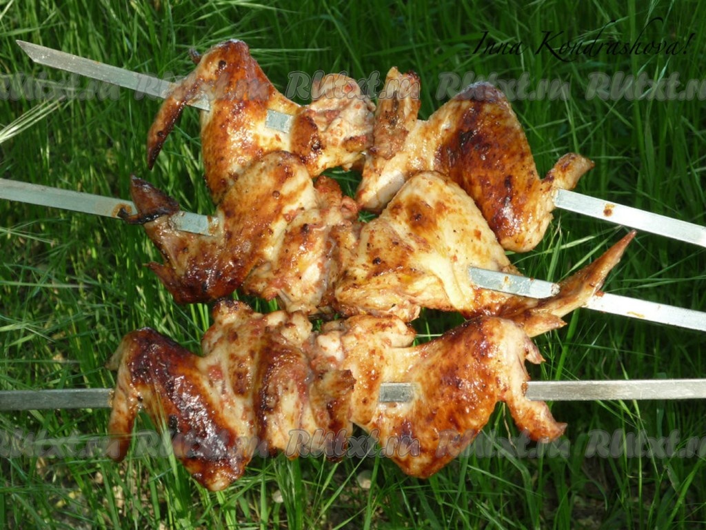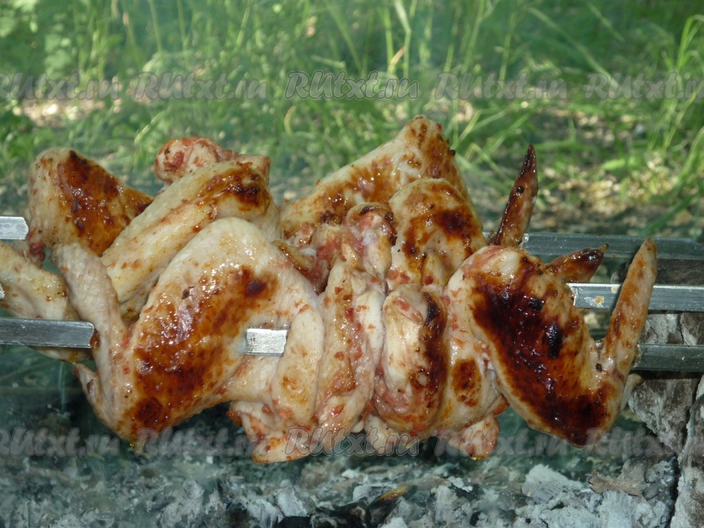 Жарить куриные крылышки на углях около получаса со всех сторон до красивой румяной корочки, периодически переворачивая и поливая томатным маринадом.