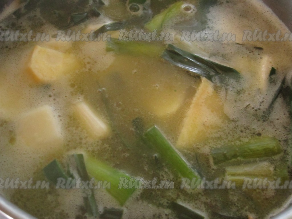 В кастрюле с толстым дном растопите сливочное масло. Слегка обжарьте на нём овощи. Затем залейте овощи водой или бульоном. Посолите по своему вкусу. Варите суп на небольшом огне около 20 минут, до готовности картофеля.
